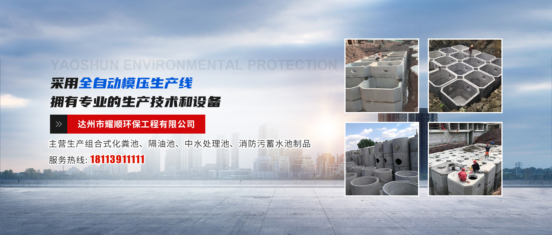 達州市耀順環(huán)保工程有限公司位于四川東北部、達州市中部通川區(qū)。本公司采用全自動模壓生產(chǎn)線,擁有專業(yè)的生產(chǎn)技術(shù)和設(shè)備,同時擁有一支專業(yè)的施工隊伍。本公司堅持質(zhì)量第一、互惠發(fā)展,讓您的居住環(huán)境更美、更舒適,是我們工人的宗旨。本公司愿與廣大建筑同仁一道,為美化城市作出貢獻。我公司現(xiàn)生產(chǎn)組合式化糞池、隔油池、中水處理池、消防污蓄水池制品。我們的產(chǎn)品在建筑工程中不斷接受檢驗,具有安裝便捷、施工安全、用時短、結(jié)構(gòu)合理、堅固耐用、抗?jié)B性能好、凈化效果明顯、經(jīng)濟合理的優(yōu)特點。...